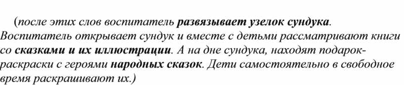 (после этих слов воспитатель развязывает узелок сундука. Воспитатель открывает сундук и вместе с детьми рассматривают книги со сказками и их иллюстрации. А на дне сундука, находят подарок- раскраски с героями народных сказок. Дети самостоятельно в свободное время раскрашивают их.)