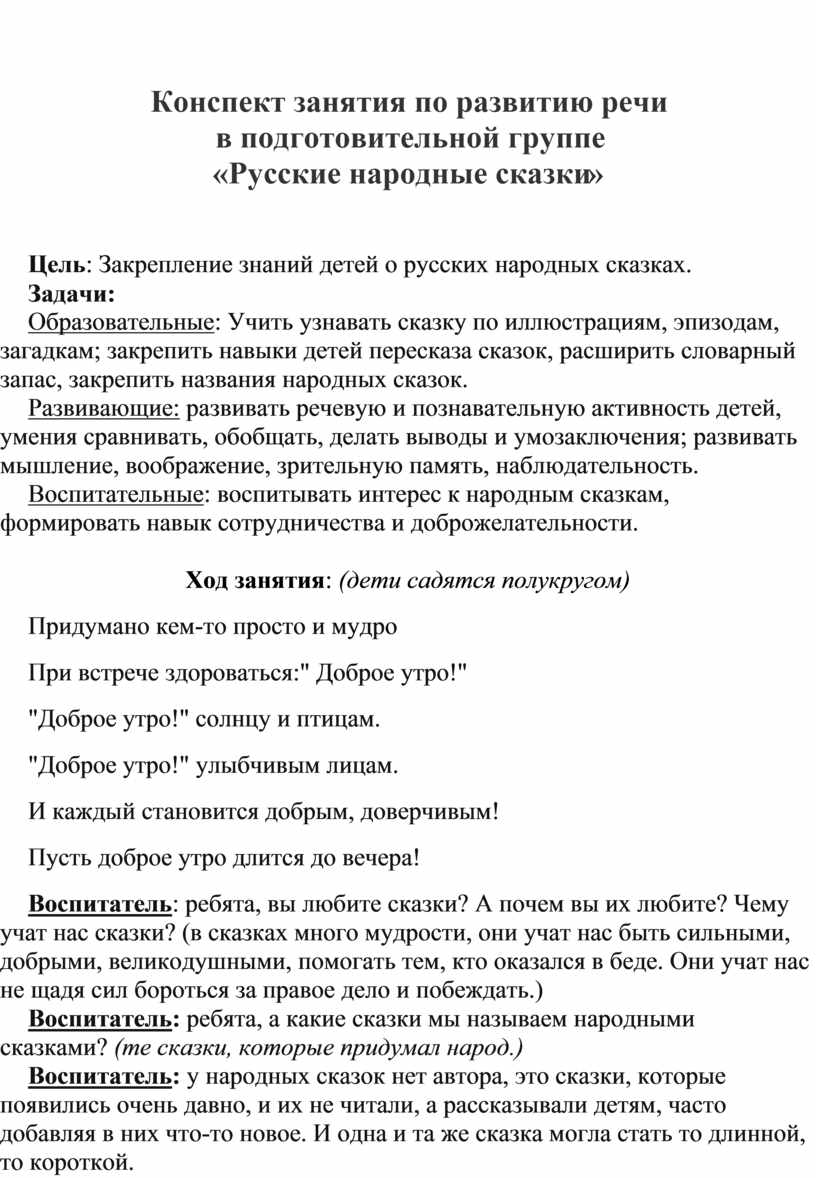 Конспект занятия по развитию речи в подготовительной группе «Русские народные сказки»