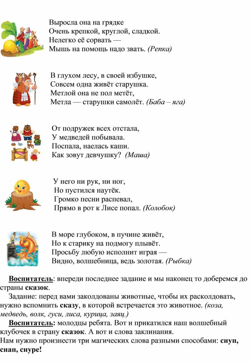 Воспитатель: молодцы ребята. Вот и прикатился наш волшебный клубочек в страну сказок. А вот и слова заклинания. Нам нужно произнести три магических слова разными способами: снуп, снап, снуре!