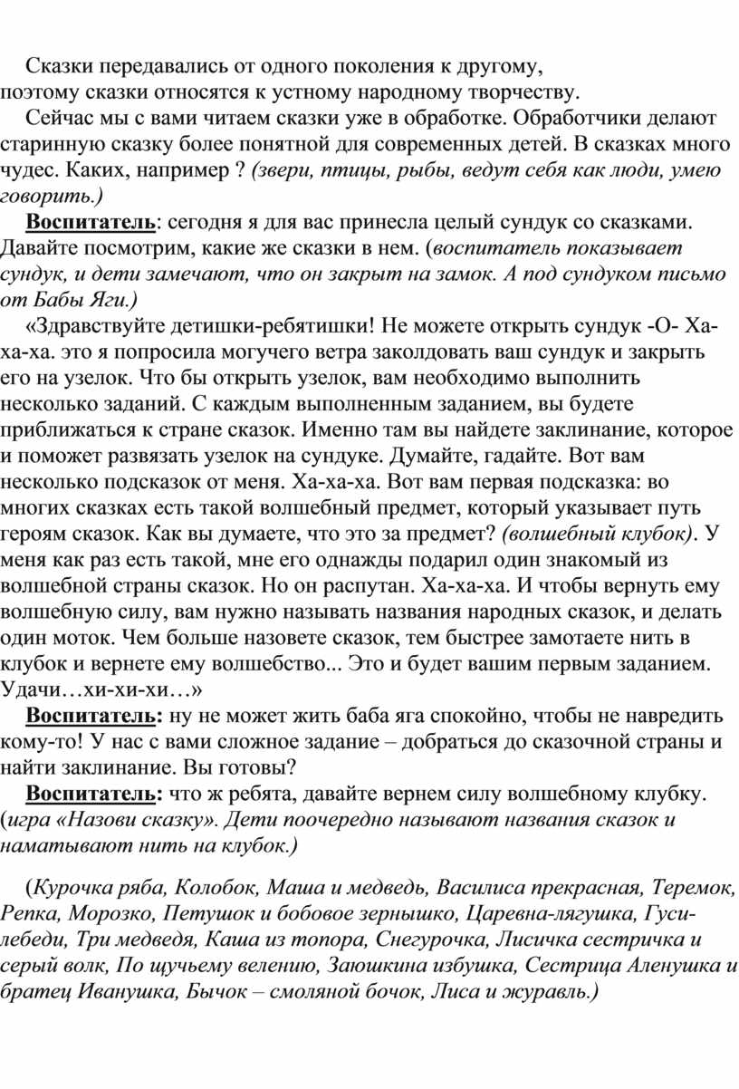 «Здравствуйте детишки-ребятишки! Не можете открыть сундук -O- Ха-ха-ха. это я попросила могучего ветра заколдовать ваш сундук и закрыть его на узелок. Что бы открыть узелок, вам необходимо выполнить несколько заданий. С каждым выполненным заданием, вы будете приближаться к стране сказок. Именно там вы найдете заклинание, которое и поможет развязать узелок на сундуке. Думайте, гадайте. Вот вам несколько подсказок от меня. Ха-ха-ха. Вот вам первая подсказка: во многих сказках есть такой волшебный предмет, который указывает путь героям сказок. Как вы думаете, что это за предмет? (волшебный клубок). У меня как раз есть такой, мне его однажды подарил один знакомый из волшебной страны сказок. Но он распутан. Ха-ха-ха. И чтобы вернуть ему волшебную силу, вам нужно называть названия народных сказок, и делать один моток. Чем больше назовете сказок, тем быстрее замотаете нить в клубок и вернете ему волшебство... Это и будет вашим первым заданием. Удачи…хи-хи-хи…»