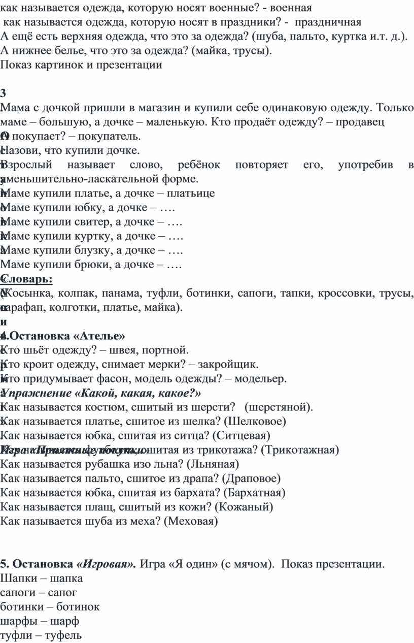 Цель: выявление знаний и формирование представлений у детей о различных видах одежды, обуви и головных уборах, и их частях, обогащение словарного запаса.