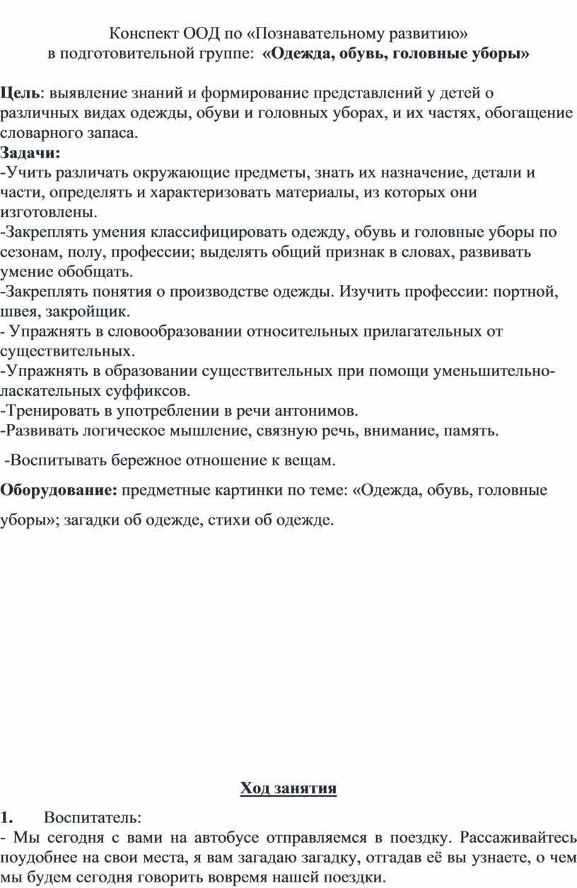 Оборудование: предметные картинки по теме: «Одежда, обувь, головные уборы»; загадки об одежде, стихи об одежде.