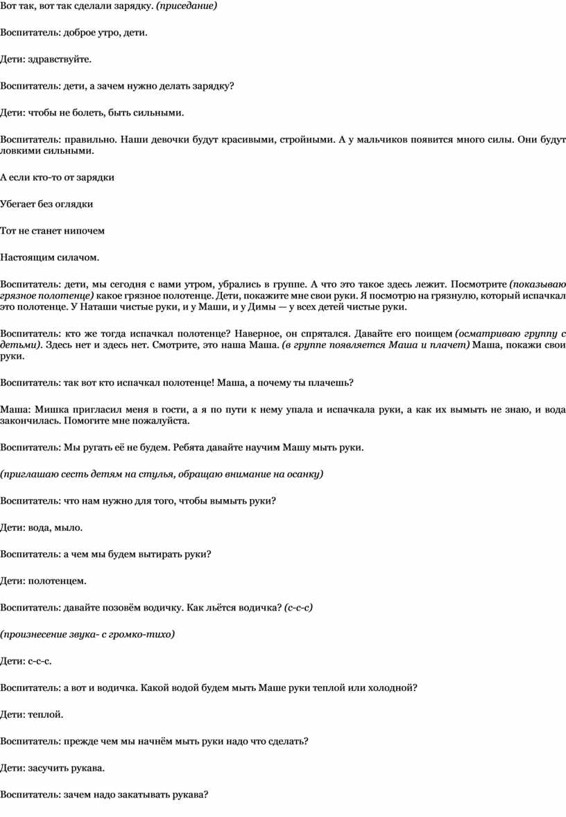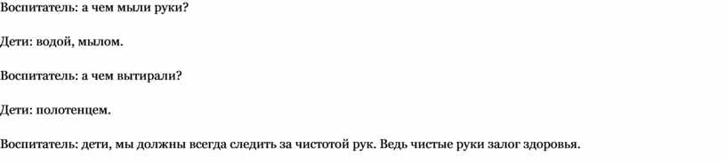 Воспитатель: дети, мы сегодня с вами утром, убрались в группе. А что это такое здесь лежит. Посмотрите (показываю грязное полотенце) какое грязное полотенце. Дети, покажите мне свои руки. Я посмотрю на грязнулю, который испачкал это полотенце. У Наташи чистые руки, и у Маши, и у Димы — у всех детей чистые руки.