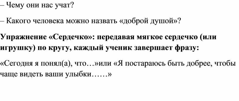 – Молодцы. Добрая душа – это человек, который умеет сопереживать, помогать, говорить правду, делиться.