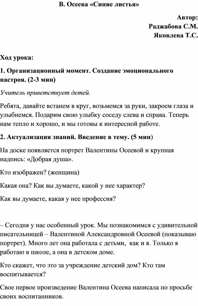 – Сегодня у нас особенный урок. Мы познакомимся с удивительной писательницей – Валентиной Александровной Осеевой (показываю портрет). Много лет она работала с детьми, как и я. Только я работаю в школе, а она в детском доме.