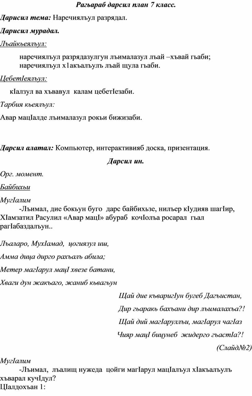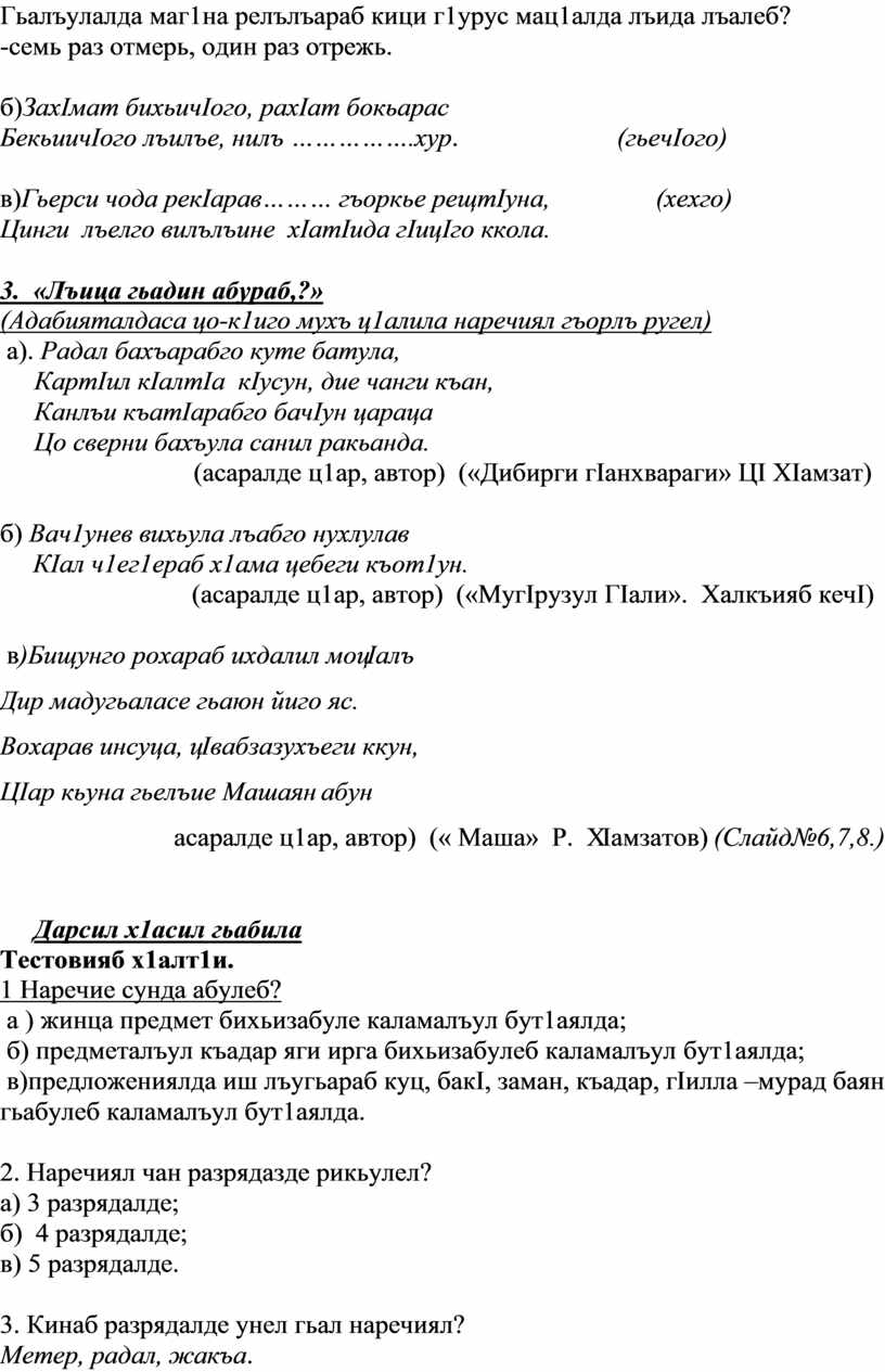 -Жакъа, лъимал, нилъеца бицине буго наречиязул разрядазул хIакъалъулъ. Хъвай, лъимал, нужеца дарсил тема тетрадазда.