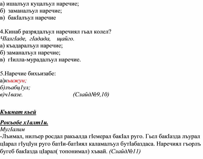 2. Заманалъул наречие. Кида? кидалъизегIан ? абурал суалазе жаваблъун бачIуна: гьабсагIат, церекъад, рогьалилъ, хасалихъе, ихдал.