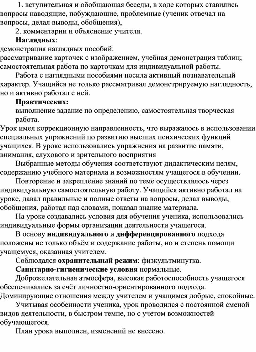 Урок строился с соблюдением дидактических принципов обучения: воспитывающей и развивающей направленности обучения, научности, доступности, наглядности, сознательности, активности учащегося и основного принципа – коррекционной направленности.
