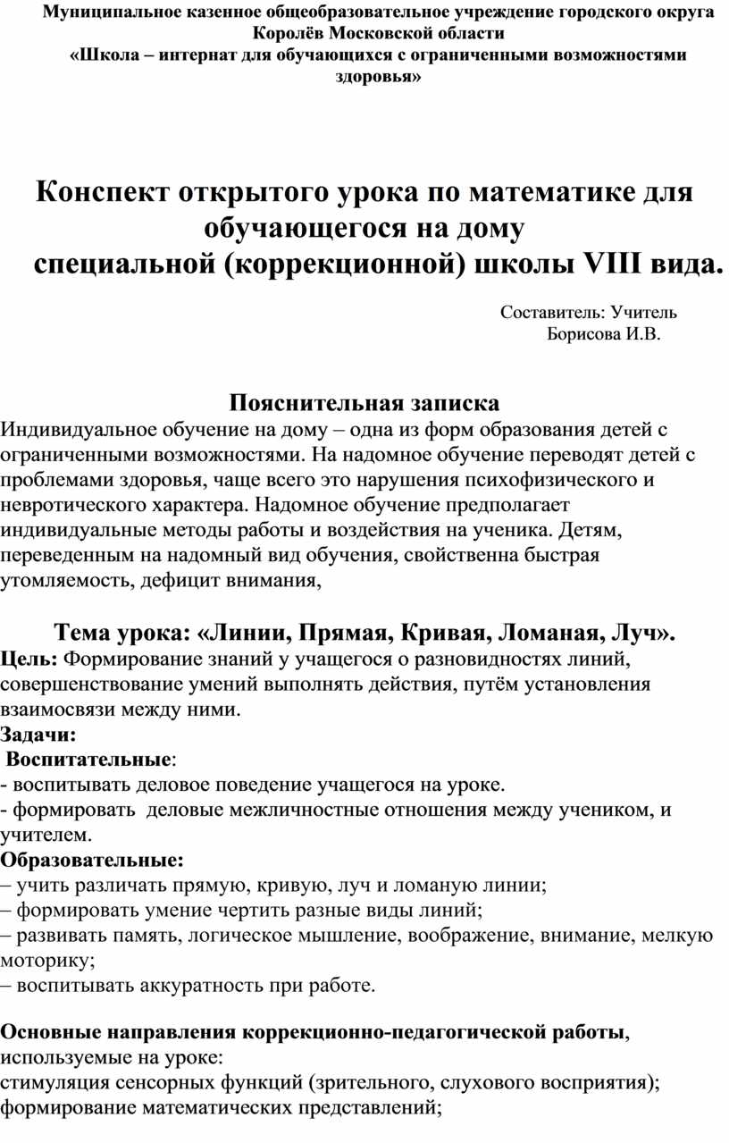 ОТКРЫТОГО УРОКА «Линии, Прямая, Кривая, Ломаная, Луч». ПРОВЕДЕННОГО С УЧЕНИКОМ 4 КЛАССА НАДОМНОГО ОБУЧЕНИЯ.