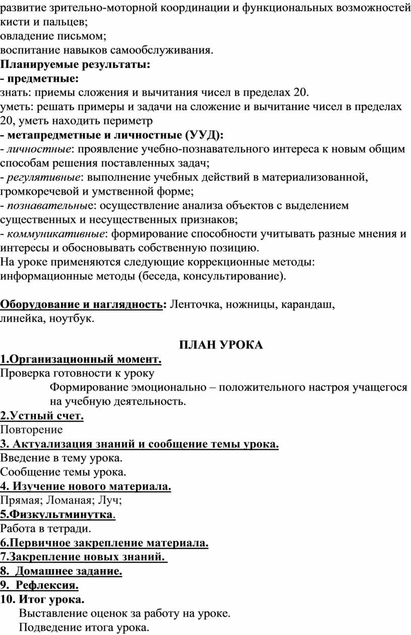 уметь: решать примеры и задачи на сложение и вычитание чисел в пределах 20, уметь находить периметр