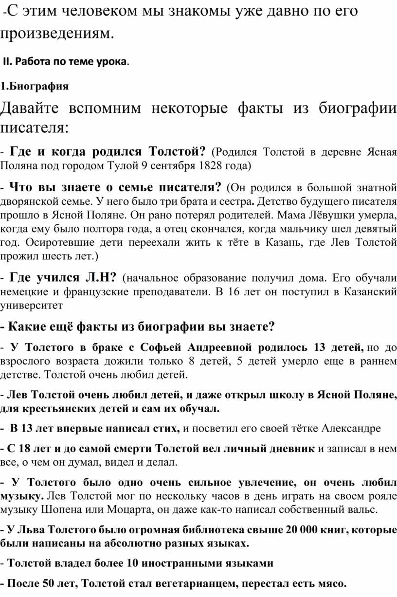 - Что вы знаете о семье писателя? (Он родился в большой знатной дворянской семье. У него было три брата и сестра. Детство будущего писателя прошло в Ясной Поляне. Он рано потерял родителей. Мама Лёвушки умерла, когда ему было полтора года, а отец скончался, когда мальчику шел девятый год. Осиротевшие дети переехали жить к тёте в Казань, где Лев Толстой прожил шесть лет.)