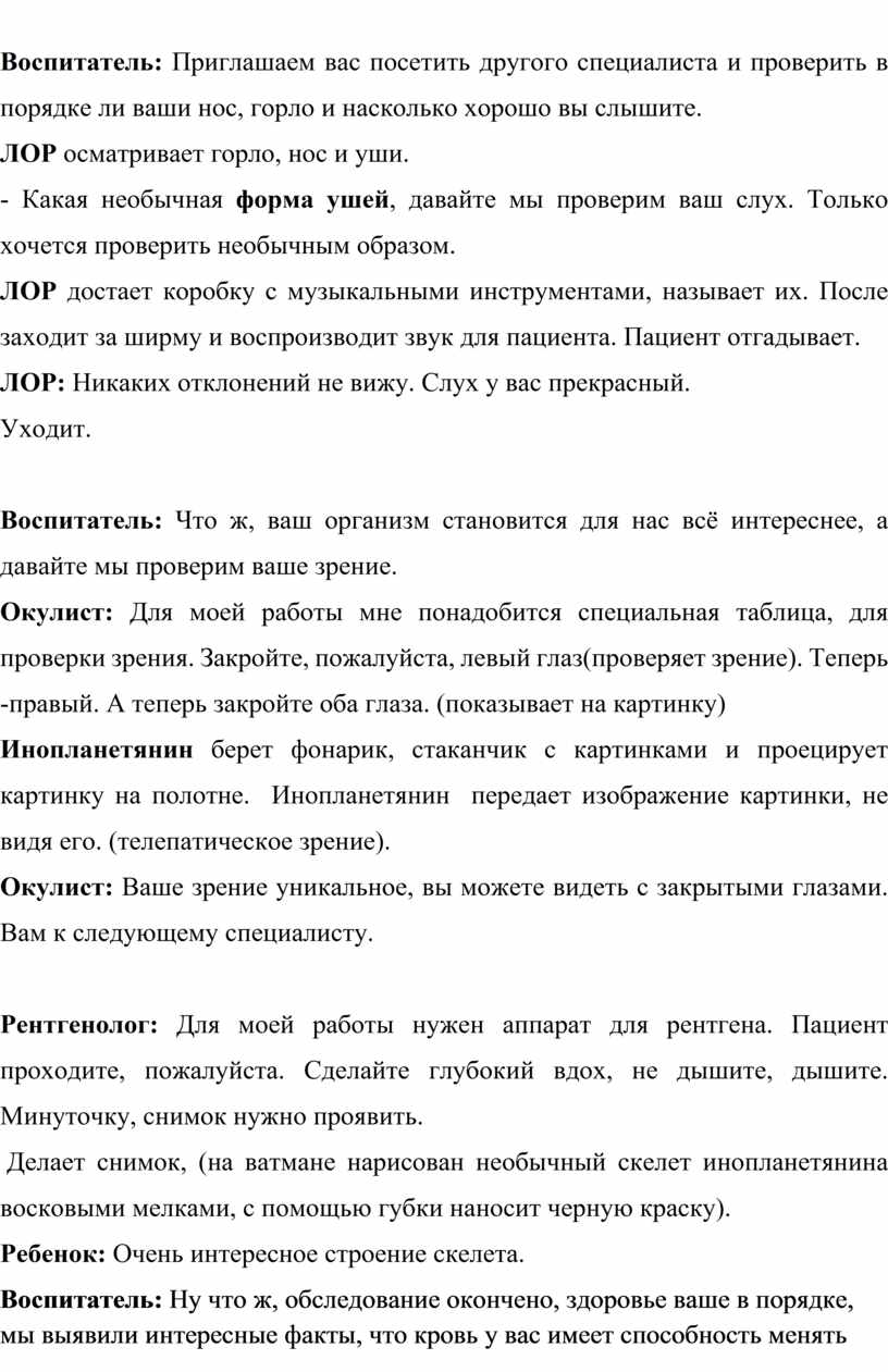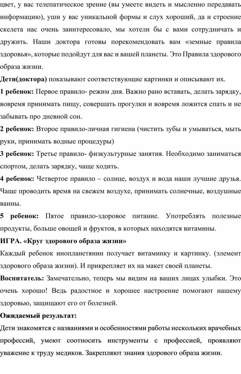 Воспитатель: Ну что ж, обследование окончено, здоровье ваше в порядке, мы выявили интересные факты, что кровь у вас имеет способность менять цвет, у вас телепатическое зрение (вы умеете видеть и мысленно передавать информацию), уши у вас уникальной формы и слух хороший, да и строение скелета нас очень заинтересовало, мы хотели бы с вами сотрудничать и дружить. Наши доктора готовы порекомендовать вам «земные правила здоровья», которые подойдут для вас и вашей планеты. Это Правила здорового образа жизни.