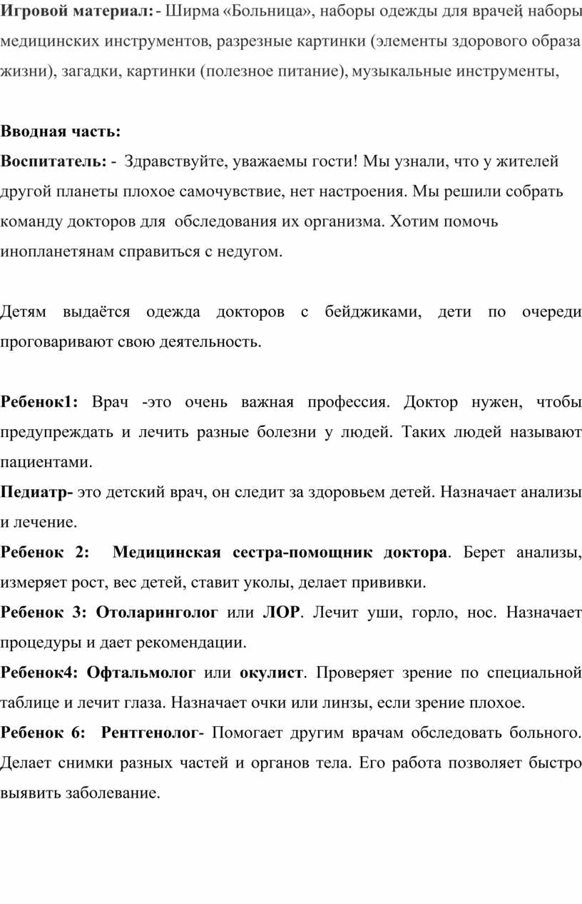 Игровой материал: - Ширма «Больница», наборы одежды для врачей, наборы медицинских инструментов, разрезные картинки (элементы здорового образа жизни), загадки, картинки (полезное питание), музыкальные инструменты,