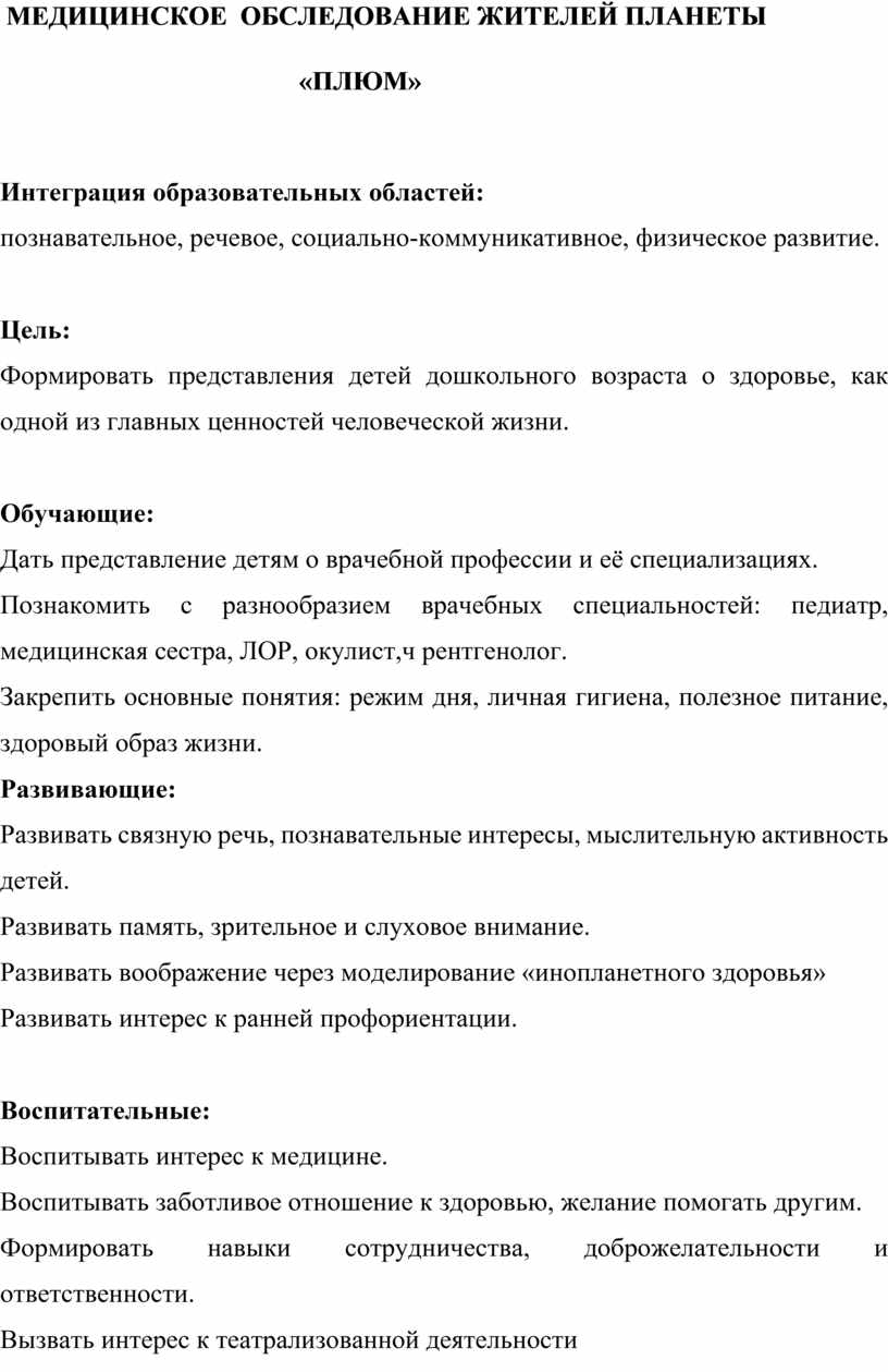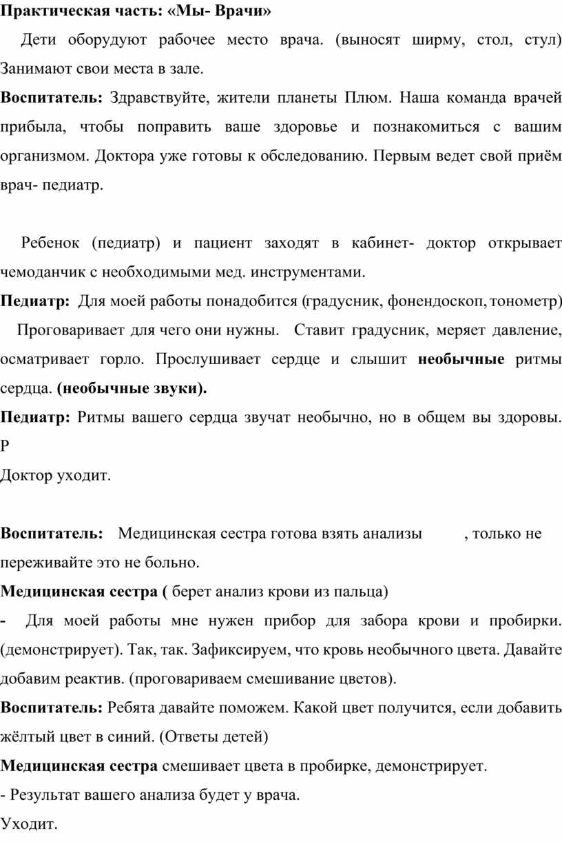 Воспитатель: Здравствуйте, жители планеты Плюм. Наша команда врачей прибыла, чтобы поправить ваше здоровье и познакомиться с вашим организмом. Доктора уже готовы к обследованию. Первым ведет свой приём врач- педиатр.