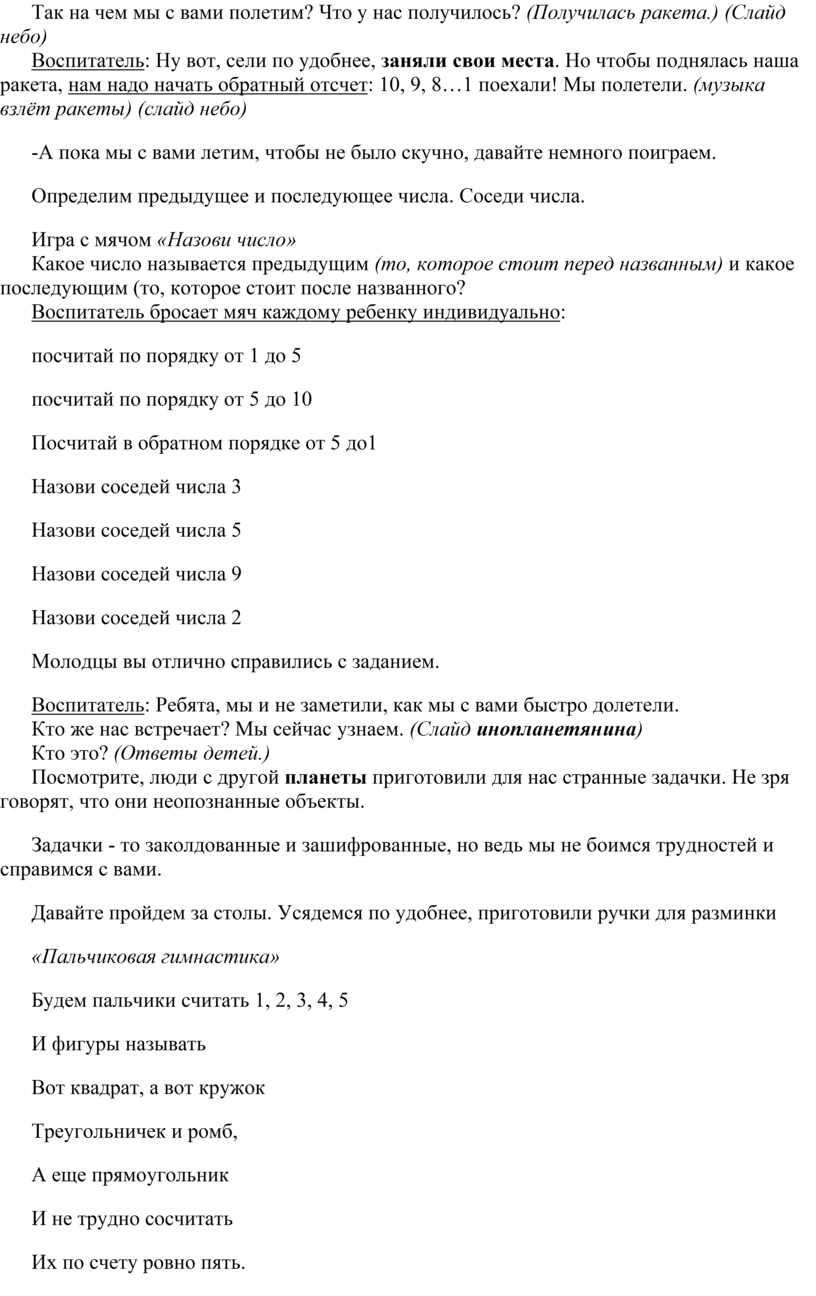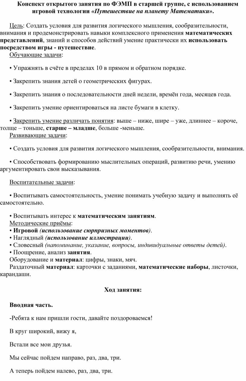 Конспект открытого занятия по ФЭМП в старшей группе, с использованием игровой технологии «Путешествие на планету Математики».
