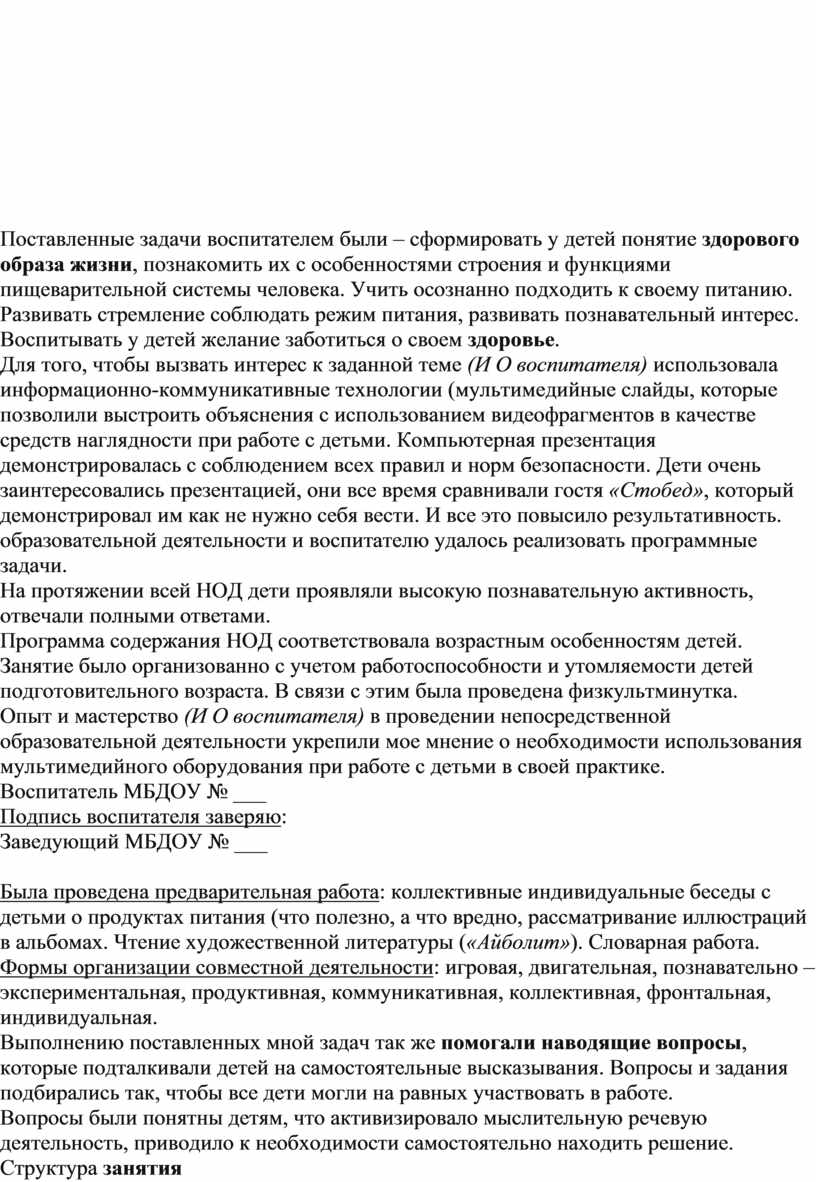 Для того, чтобы вызвать интерес к заданной теме (И О воспитателя) использовала информационно-коммуникативные технологии (мультимедийные слайды, которые позволили выстроить объяснения с использованием видеофрагментов в качестве средств наглядности при работе с детьми. Компьютерная презентация демонстрировалась с соблюдением всех правил и норм безопасности. Дети очень заинтересовались презентацией, они все время сравнивали гостя «Стобед», который демонстрировал им как не нужно себя вести. И все это повысило результативность. образовательной деятельности и воспитателю удалось реализовать программные задачи.