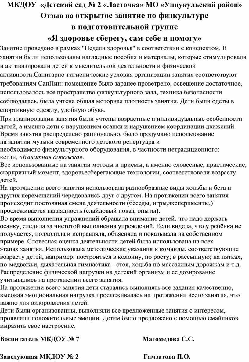 Занятие проведено в рамках "Недели здоровья" в соответствии с конспектом. В занятии были использованы наглядные пособия и материалы, которые стимулировали и активизировали детей к мыслительной деятельности и физической активности.Санитарно-гигиенические условия организации занятия соответствуют требованиям СанПин: помещение было заранее проветрено, освещение достаточное, использовалось все пространство физкультурного зала, техника безопасности соблюдалась, была учтена общая моторная плотность занятия. Дети были одеты в спортивную одежду, удобную обувь.