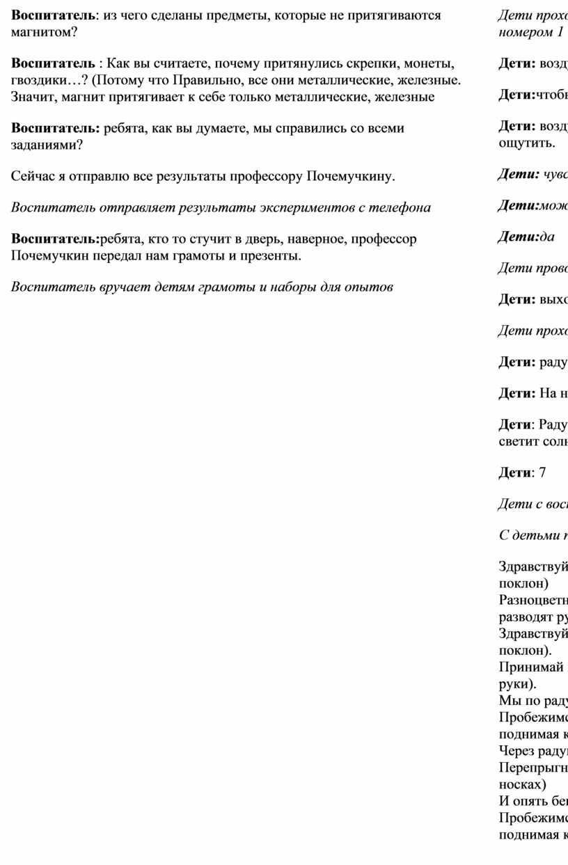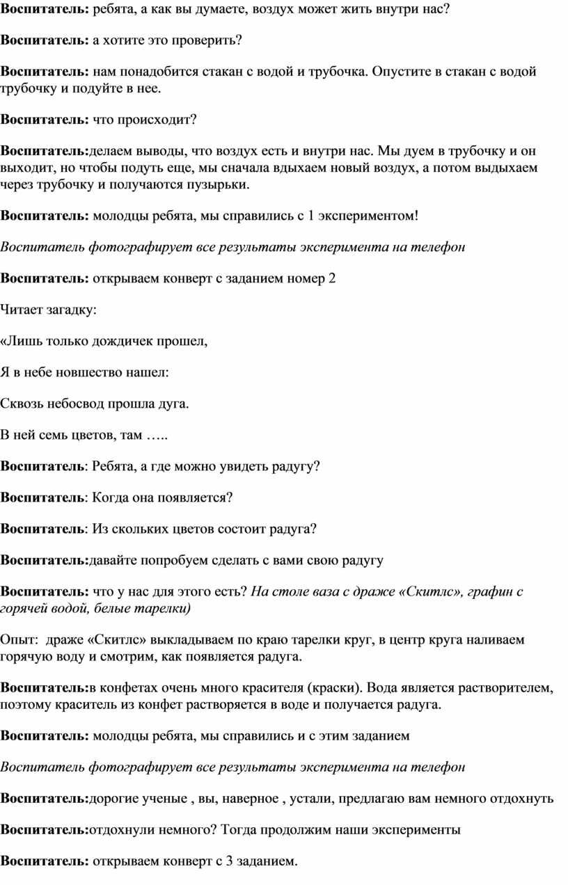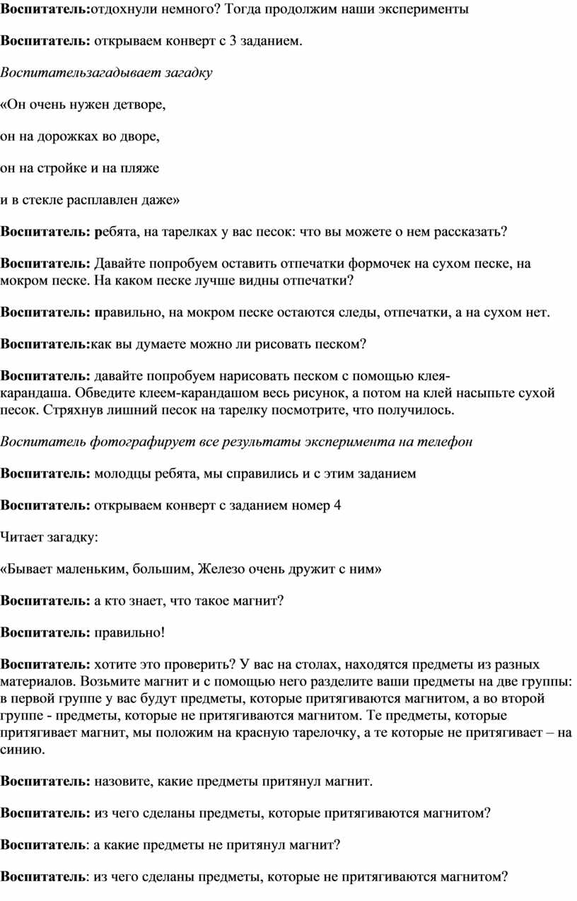 Воспитатель: открываем конверт с 1 заданием. Воспитательзагадывает загадку «Через нос проходит в грудь И обратно держит путь. Он невидимый, и все же Без него мы жить не можем! Воспитатель: правильно, воздух. Воспитатель: ребята, а для чего нам нужен воздух? Воспитатель: ребята, а мы можем почувствовать движение воздуха? А увидеть? Воспитатель: возьмите веера и помашите им в лицо, вокруг себя. Что вы чувствуете? Воспитатель: правильно, воздух движется и он вокруг нас. Воспитатель: ребята, а как вы думаете, воздух может жить внутри нас? Воспитатель: а хотите это проверить? Воспитатель: нам понадобится стакан с водой и трубочка. Опустите в стакан с водой трубочку и подуйте в нее. Воспитатель: что происходит? Воспитатель:делаем выводы, что воздух есть и внутри нас. Мы дуем в трубочку и он выходит, но чтобы подуть еще, мы сначала вдыхаем новый воздух, а потом выдыхаем через трубочку и получаются пузырьки. Воспитатель: молодцы ребята, мы справились с 1 экспериментом! Воспитатель фотографирует все результаты эксперимента на телефон Воспитатель: открываем конверт с заданием номер 2 Читает загадку: «Лишь только дождичек прошел, Я в небе новшество нашел: Сквозь небосвод прошла дуга. В ней семь цветов, там ….. Воспитатель: Ребята, а где можно увидеть радугу? Воспитатель: Когда она появляется? Воспитатель: Из скольких цветов состоит радуга? Воспитатель:давайте попробуем сделать с вами свою радугу Воспитатель: что у нас для этого есть? На столе ваза с драже «Скитлс», графин с горячей водой, белые тарелки) Опыт: драже «Скитлс» выкладываем по краю тарелки круг, в центр круга наливаем горячую воду и смотрим, как появляется радуга. Воспитатель:в конфетах очень много красителя (краски). Вода является растворителем, поэтому краситель из конфет растворяется в воде и получается радуга. Воспитатель: молодцы ребята, мы справились и с этим заданием Воспитатель фотографирует все результаты эксперимента на телефон Воспитатель:дорогие ученые , вы, наверное , устали, предлагаю вам немного отдохнуть Воспитатель:отдохнули немного? Тогда продолжим наши эксперименты Воспитатель: открываем конверт с 3 заданием. Воспитательзагадывает загадку «Он очень нужен детворе, он на дорожках во дворе, он на стройке и на пляже и в стекле расплавлен даже» Воспитатель: ребята, на тарелках у вас песок: что вы можете о нем рассказать? Воспитатель: Давайте попробуем оставить отпечатки формочек на сухом песке, на мокром песке. На каком песке лучше видны отпечатки? Воспитатель: правильно, на мокром песке остаются следы, отпечатки, а на сухом нет. Воспитатель:как вы думаете можно ли рисовать песком? Воспитатель: давайте попробуем нарисовать песком с помощью клея-карандаша. Обведите клеем-карандашом весь рисунок, а потом на клей насыпьте сухой песок. Стряхнув лишний песок на тарелку посмотрите, что получилось. Воспитатель фотографирует все результаты эксперимента на телефон Воспитатель: молодцы ребята, мы справились и с этим заданием Воспитатель: открываем конверт с заданием номер 4 Читает загадку: «Бывает маленьким, большим, Железо очень дружит с ним» Воспитатель: а кто знает, что такое магнит? Воспитатель: правильно! Воспитатель: хотите это проверить? У вас на столах, находятся предметы из разных материалов. Возьмите магнит и с помощью него разделите ваши предметы на две группы: в первой груп