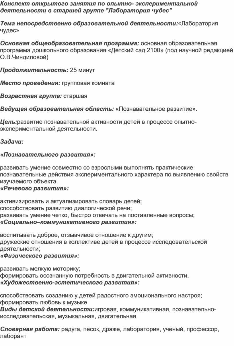 Конспект открытого занятия по опытно- экспериментальной деятельности в старшей группе "Лаборатория чудес"