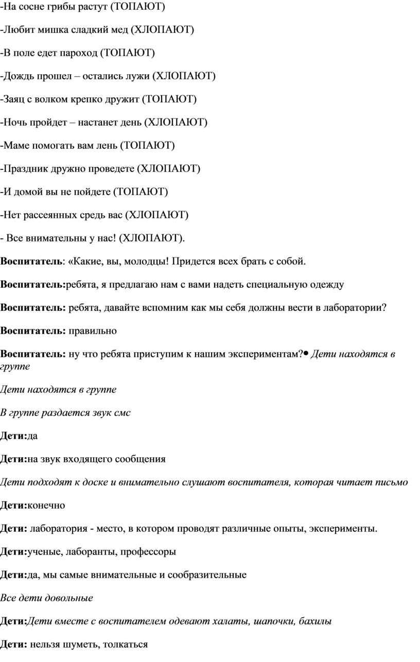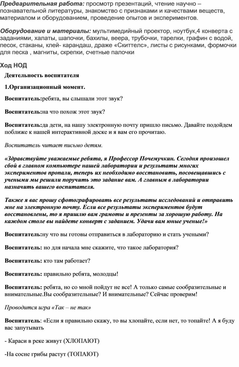 Воспитатель:ребята, вы слышали этот звук? Воспитатель:на что похож этот звук? Воспитатель:да дети, на нашу электронную почту пришло письмо. Давайте подойдем поближе к нашей интерактивной доске и я вам его прочитаю. Воспитатель читает письмо детям. «Здравствуйте уважаемые ребята, я Профессор Почемучкин. Сегодня произошел сбой в главном компьютере нашей лаборатории и результаты многих экспериментов пропали, теперь их необходимо восстановить, посовещавшись с учеными мы решили поручить это задание вам. А главным в лаборатории назначить вашего воспитателя. Также я вас прошу сфотографировать все результаты исследований и отправить мне на электронную почту. Если все результаты экспериментов будут восстановлены, то я пришлю вам грамоты и презенты за хорошую работу. На каждом столе вы найдете конверт с заданием. Удачи вам юные ученые!» Воспитатель:ну что вы готовы отправиться в лабораторию и стать учеными? Воспитатель: но для начала мне скажите, что такое лаборатория? Воспитатель: кто там работает? Воспитатель: правильно ребята, молодцы! Воспитатель: ребята, но со мной пойдут не все! А только самые сообразительные и внимательные.Вы сообразительные? И внимательные? Сейчас проверим! Проводится игра «Так – не так» Воспитатель: «Если я правильно скажу, то вы хлопайте, если нет, то топайте! А я буду вас запутывать - Караси в реке живут (ХЛОПАЮТ) -На сосне грибы растут (ТОПАЮТ) -Любит мишка сладкий мед (ХЛОПАЮТ) -В поле едет пароход (ТОПАЮТ) -Дождь прошел – остались лужи (ХЛОПАЮТ) -Заяц с волком крепко дружит (ТОПАЮТ) -Ночь пройдет – настанет день (ХЛОПАЮТ) -Маме помогать вам лень (ТОПАЮТ) -Праздник дружно проведете (ХЛОПАЮТ) -И домой вы не пойдете (ТОПАЮТ) -Нет рассеянных средь вас (ХЛОПАЮТ) - Все внимательны у нас! (ХЛОПАЮТ). Воспитатель: «Какие, вы, молодцы! Придется всех брать с собой. Воспитатель:ребята, я предлагаю нам с вами надеть специальную одежду Воспитатель: ребята, давайте вспомним как мы себя должны вести в лаборатории? Воспитатель: правильно Воспитатель: ну что ребята приступим к нашим экспериментам? |