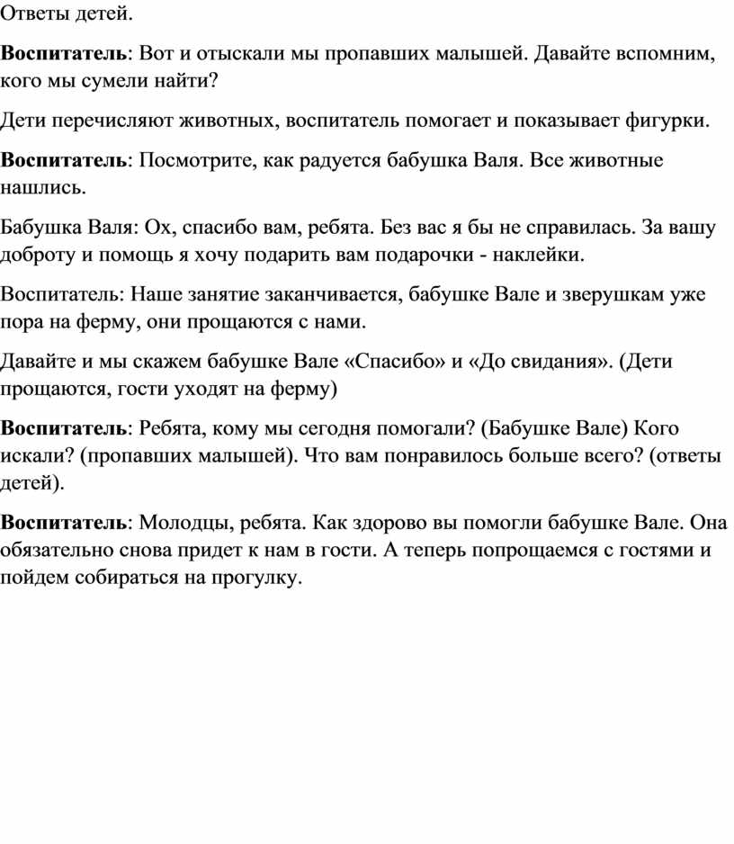 Воспитатель: Посмотрите, как радуется бабушка Валя. Все животные нашлись.