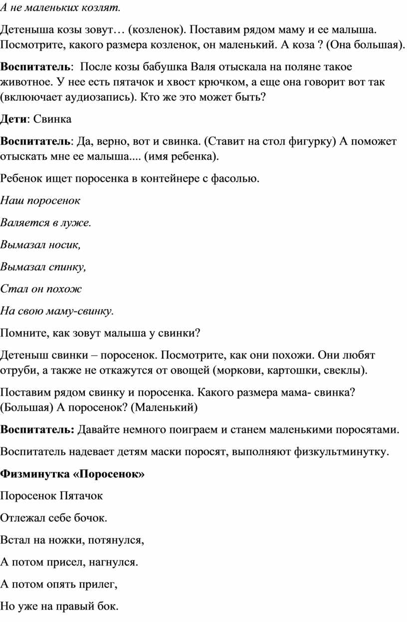 Материалы и оборудование: кукла (бабушка Валя), фигурки домашних животных и их детенышей (разные по размеру), наклейки, контейнеры с разрезанной на маленькие полоски зеленой и желтой бумагой, контейнер с фасолью, аудиозапись с голосами животных, маски поросят.