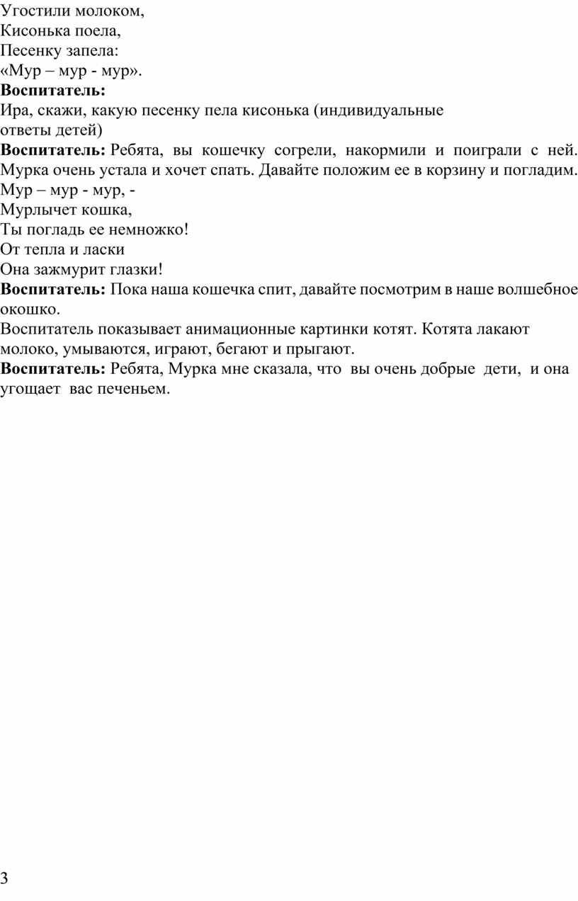 Воспитатель: Ребята, Мурка красивая. У кошечки мягкая шерсть, большой, пушистый хвост. Саша, подойди и погладь ее. Настя, покажи, а где у кошки ушки, усы - удивительной красы, глазки, которыми она видит даже ночью, маленькие лапки, в которых есть коготки?