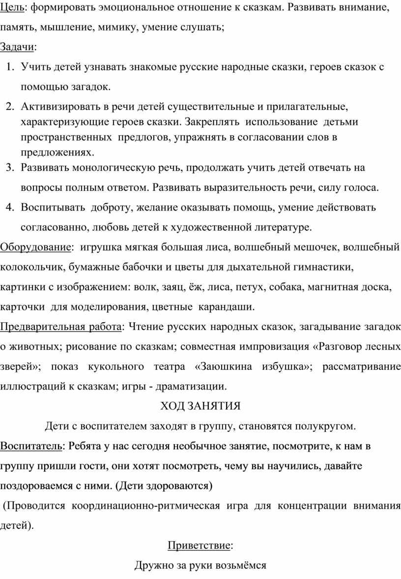 Оборудование: игрушка мягкая большая лиса, волшебный мешочек, волшебный колокольчик, бумажные бабочки и цветы для дыхательной гимнастики, картинки с изображением: волк, заяц, ёж, лиса, петух, собака, магнитная доска, карточки для моделирования, цветные карандаши.