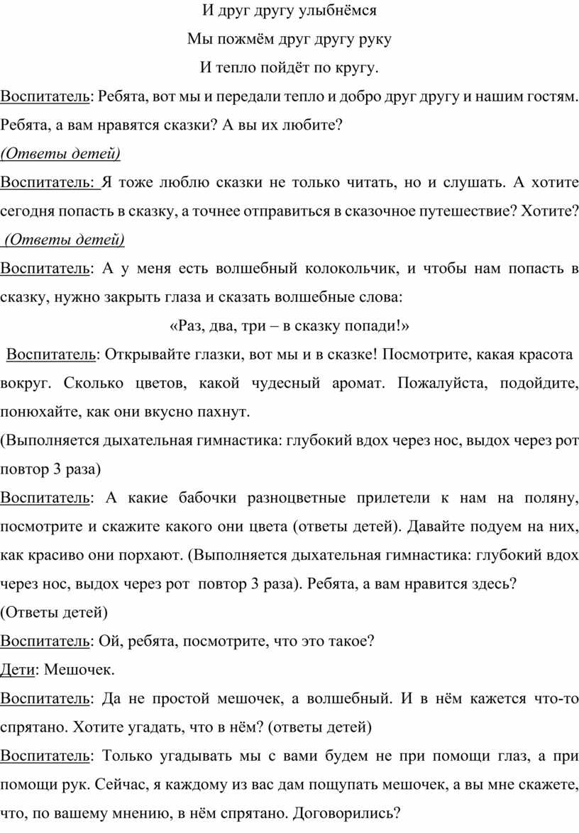 Воспитатель: А у меня есть волшебный колокольчик, и чтобы нам попасть в сказку, нужно закрыть глаза и сказать волшебные слова: