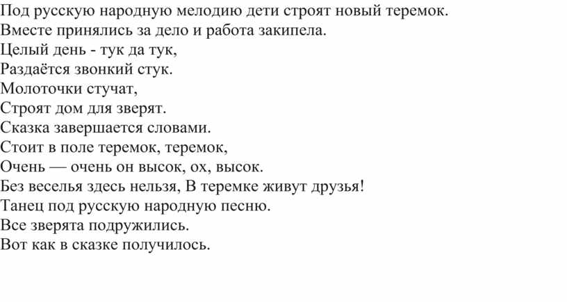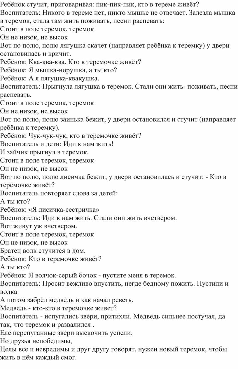 Терем-теремок, не низок - не высок, мышка-норушка, лягушка-квакушка, зайчик-побегайчик, лисичка-сестричка, волчок - серый бочок, косолапый медведь.