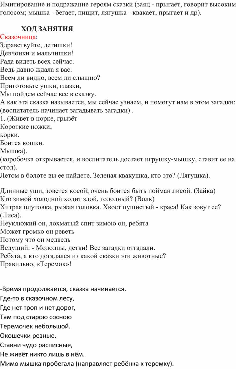 Имитирование и подражание героям сказки (заяц - прыгает, говорит высоким голосом; мышка - бегает, пищит, лягушка - квакает, прыгает и др.) .