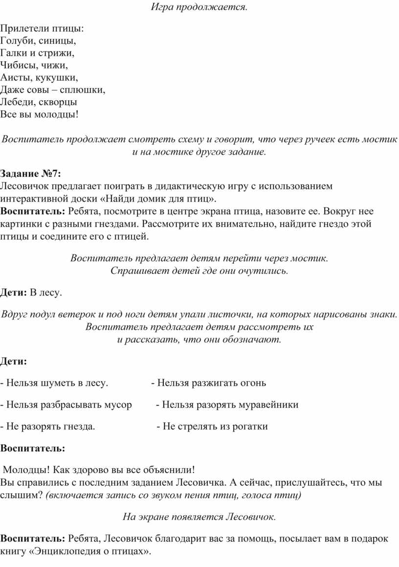 Молодцы! Как здорово вы все объяснили! Вы справились с последним заданием Лесовичка. А сейчас, прислушайтесь, что мы слышим? (включается запись со звуком пения птиц, голоса птиц)