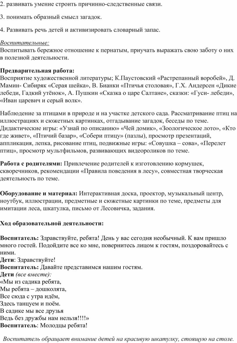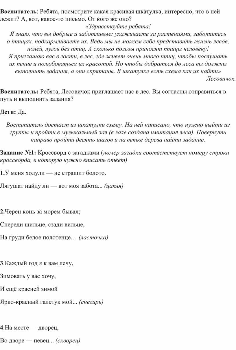 «Здравствуйте ребята! Я знаю, что вы добрые и заботливые: ухаживаете за растениями, заботитесь о птицах, подкармливаете их. Ведь мы не можем себе представить жизнь лесов, полей, лугов без птиц. А сколько пользы приносят птицы человеку! Я приглашаю вас в гости, в лес, где живет очень много птиц, чтобы послушать их пение и полюбоваться их красотой. Но чтобы добраться до леса вы должны выполнить задания, а они спрятаны. В шкатулке есть схема как их найти»