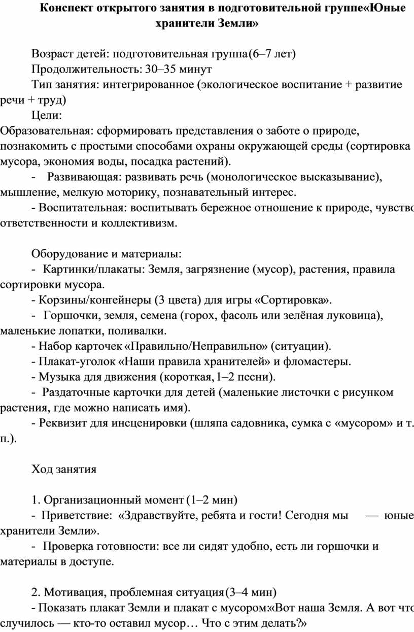 Конспект открытого занятия в подготовительной группе «Юные хранители Земли»