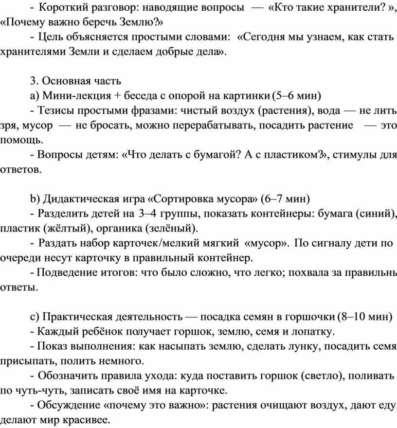 - Цель объясняется простыми словами: «Сегодня мы узнаем, как стать хранителями Земли и сделаем добрые дела».