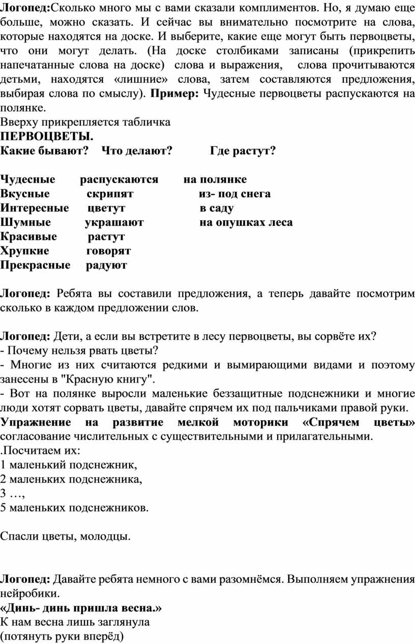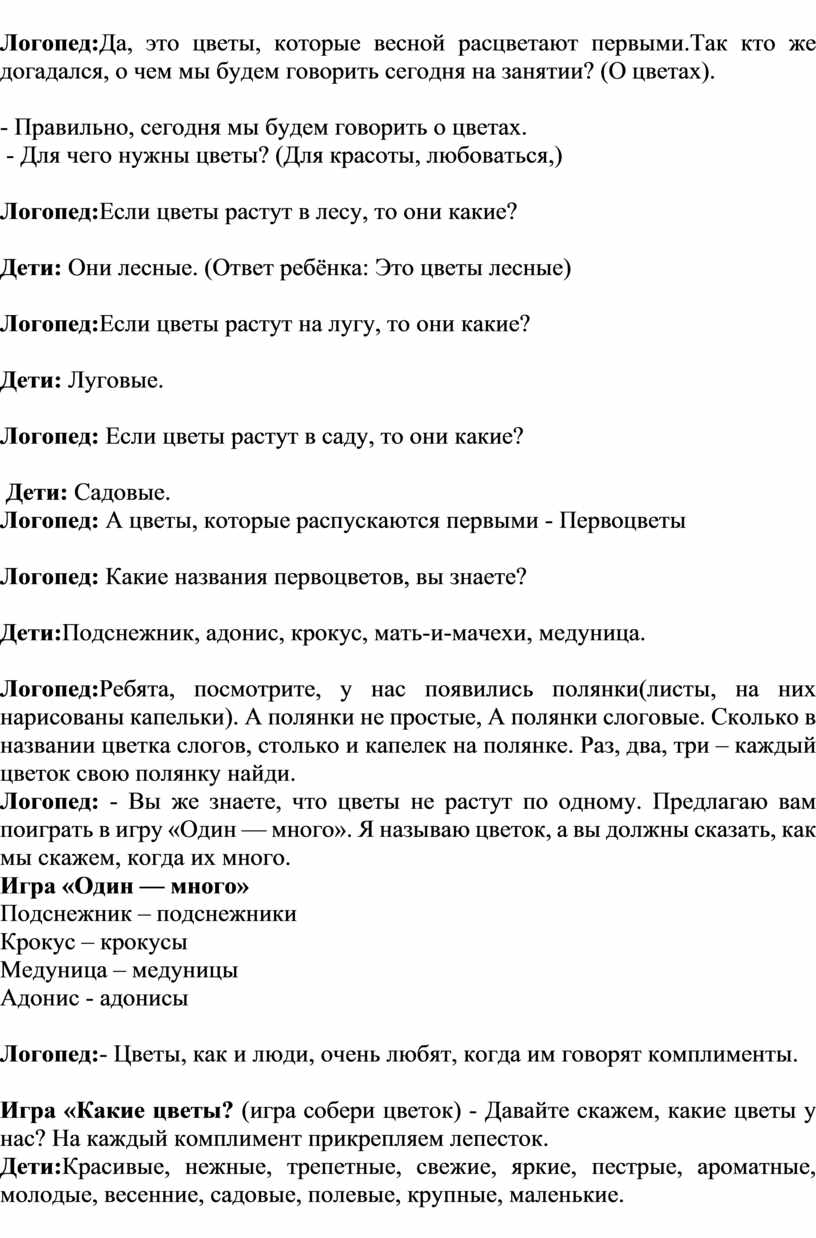 Логопед:А, что мы с вами можем сделать для того, чтобы помочь цветам выжить? (Не рвать самим и не давать рвать другим, не покупать букеты из первоцветов.) Все правильно! Сделаем все, что в наших силах, чтобы сберечь красоту весенних лугов и полей, многообразие цветочного мира нашего края.