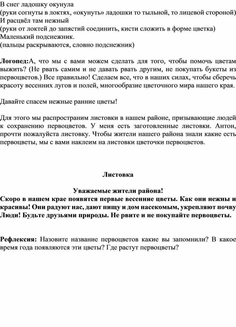 Для этого мы распространим листовки в нашем районе, призывающие людей к сохранению первоцветов. У меня есть заготовленные листовки. Антон, прочти пожалуйста листовку. Чтобы жители нашего района знали какие есть первоцветы, мы с вами наклеим на листовки цветочки первоцветов.