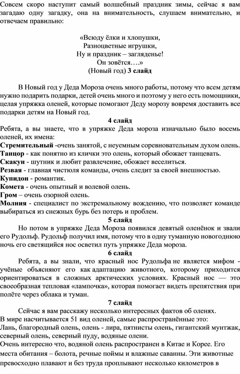 Правильно, ребята, это - олень. Северный олень — это такой же неотъемлемый символ зимних праздников, как и Дед Мороз. Разве что только более скромный, что свойственно этому животному по природе. Совсем скоро наступит самый волшебный праздник зимы, сейчас я вам загадаю одну загадку, она на внимательность, слушаем внимательно, и отвечаем правильно: