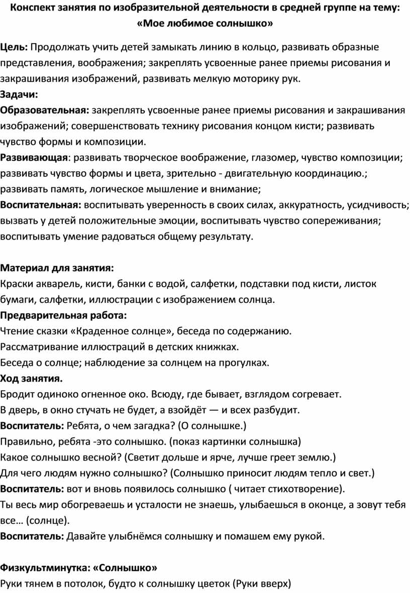Конспект занятия по изобразительной деятельности в средней группе на тему: «Мое любимое солнышко»