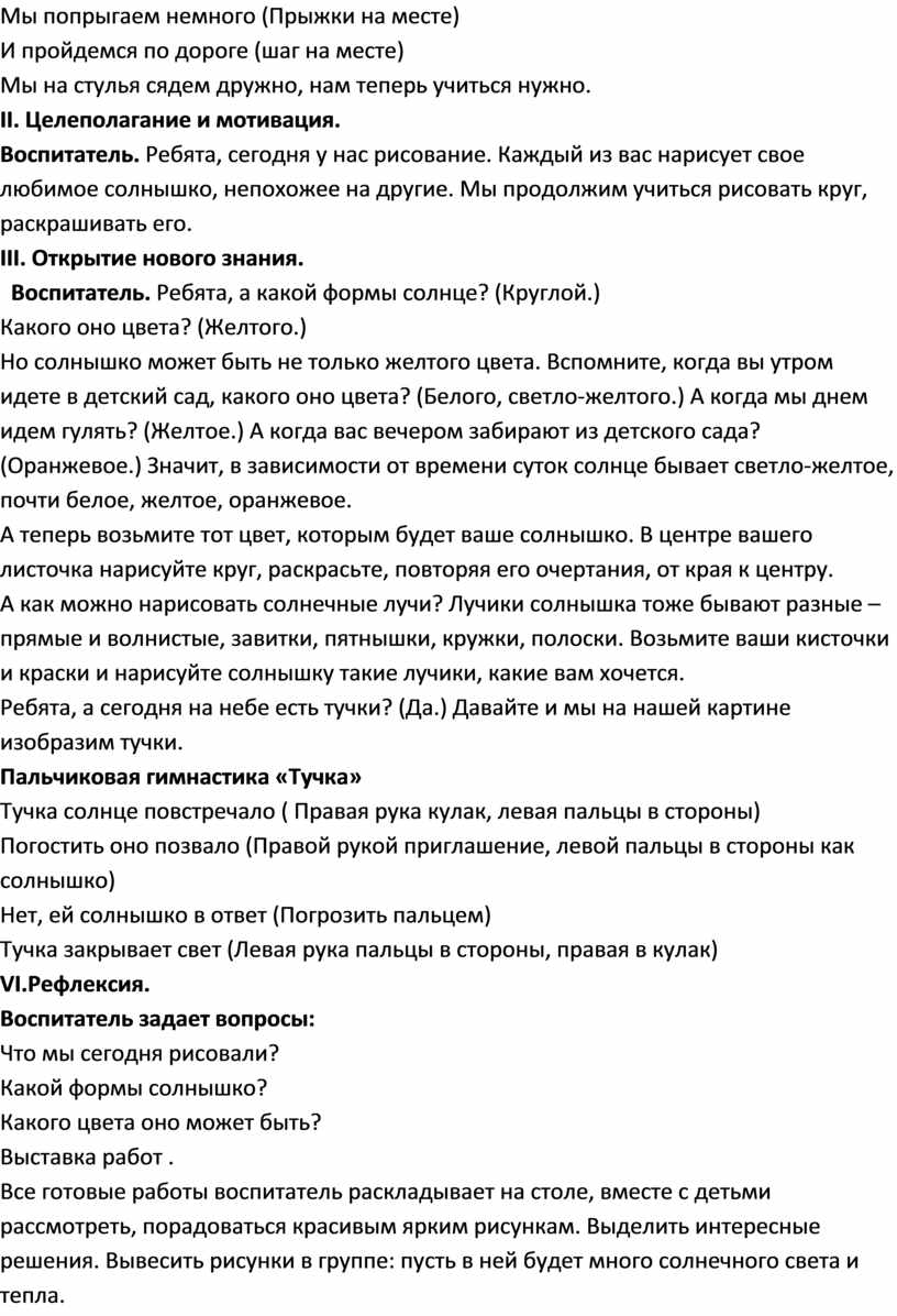Воспитатель. Ребята, сегодня у нас рисование. Каждый из вас нарисует свое любимое солнышко, непохожее на другие. Мы продолжим учиться рисовать круг, раскрашивать его.