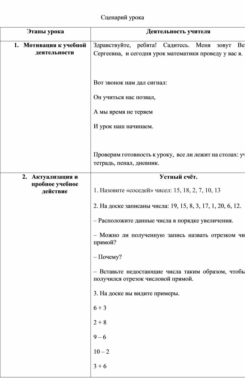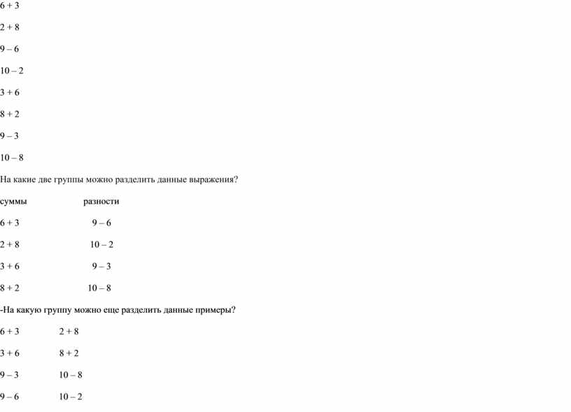 Устный счёт. 1. Назовите «соседей» чисел: 15, 18, 2, 7, 10, 13 2. На доске записаны числа: 19, 15, 8, 3, 17, 1, 20, 6, 12. – Расположите данные числа в порядке увеличения. – Можно ли полученную запись назвать отрезком числовой прямой? – Почему? – Вставьте недостающие числа таким образом, чтобы у вас получился отрезок числовой прямой. 3. На доске вы видите примеры. 6 + 3 2 + 8 9 – 6 10 – 2 3 + 6 8 + 2 9 – 3 10 – 8 На какие две группы можно разделить данные выражения? суммы разности 6 + 3 9 – 6 2 + 8 10 – 2 3 + 6 9 – 3 8 + 2 10 – 8 -На какую группу можно еще разделить данные примеры? 6 + 3 2 + 8 3 + 6 8 + 2 9 – 3 10 – 8 9 – 6 10 – 2