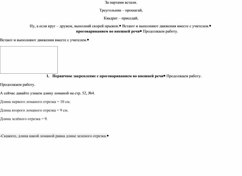 Мы дружно трудились, Немного устали. Быстро все сразу За партами встали. Треугольник – прошагай, Квадрат – приседай, Ну, а если круг – дружок, выполняй скорей прыжок. |