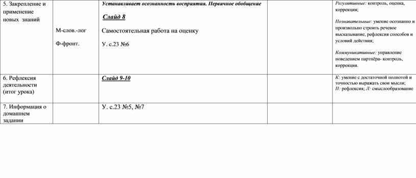 Регулятивные: контроль, оценка, коррекция; Познавательные: умение осознанно и произвольно строить речевое высказывание, рефлексия способов и условий действия; Коммуникативные: управление поведением партнёра- контроль, коррекция. |
