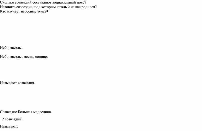 Сколько созвездий составляют зодиакальный пояс? Назовите созвездие, под которым каждый из вас родился? Кто изучает небесные тела? |