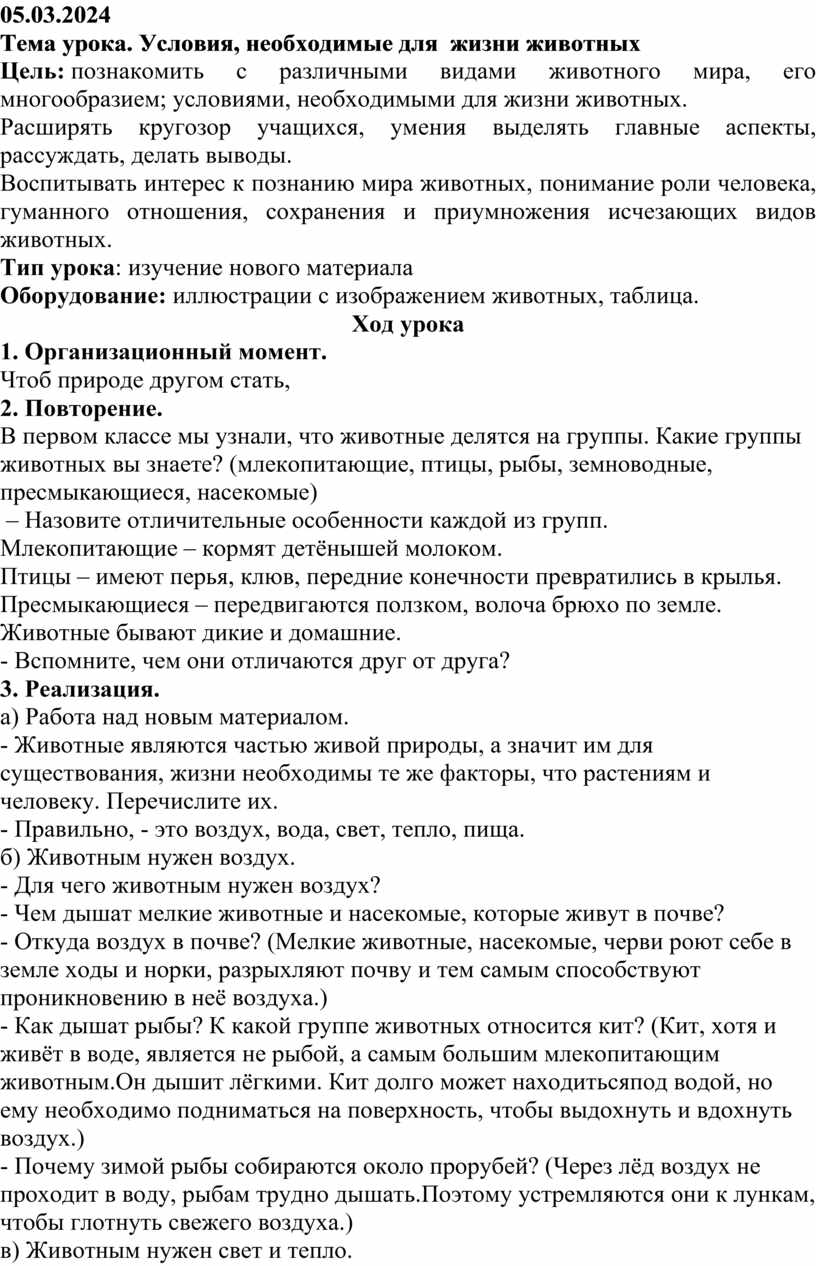 Цель: познакомить с различными видами животного мира, его многообразием; условиями, необходимыми для жизни животных.