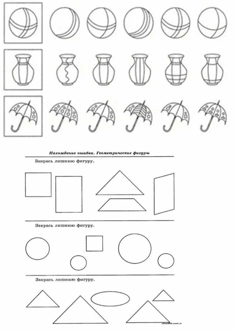 Содержание: педагог раскладывает перед ребенком ряды геометрических фигур: три четырехугольника и один треугольник, три овала и один кpyг и др. Ребенку предлагается выделить в каждом ряду «лишнюю» фигуру и объяснить свое решение.