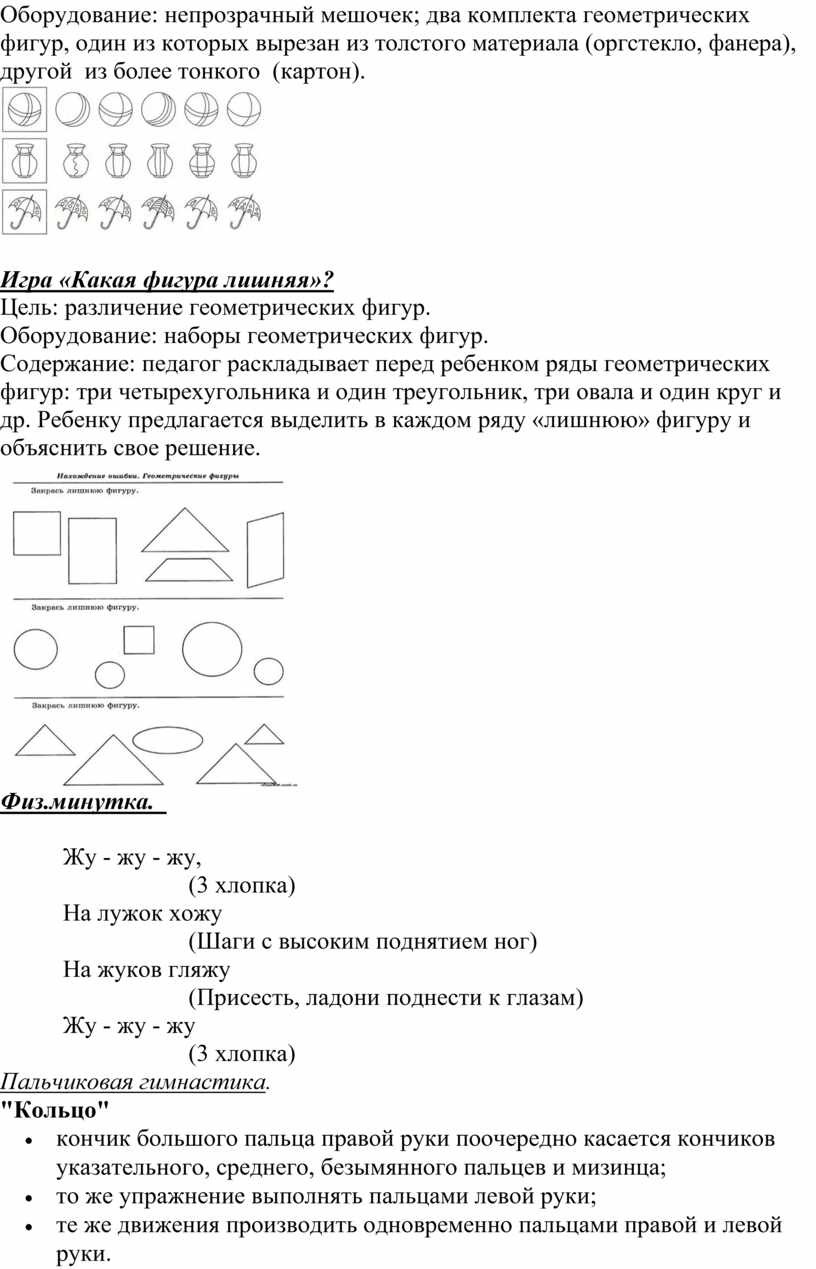 Оборудование: непрозрачный мешочек; два комплекта гeoметрических фигур и предметов, один из которых вырезан из толстого материала