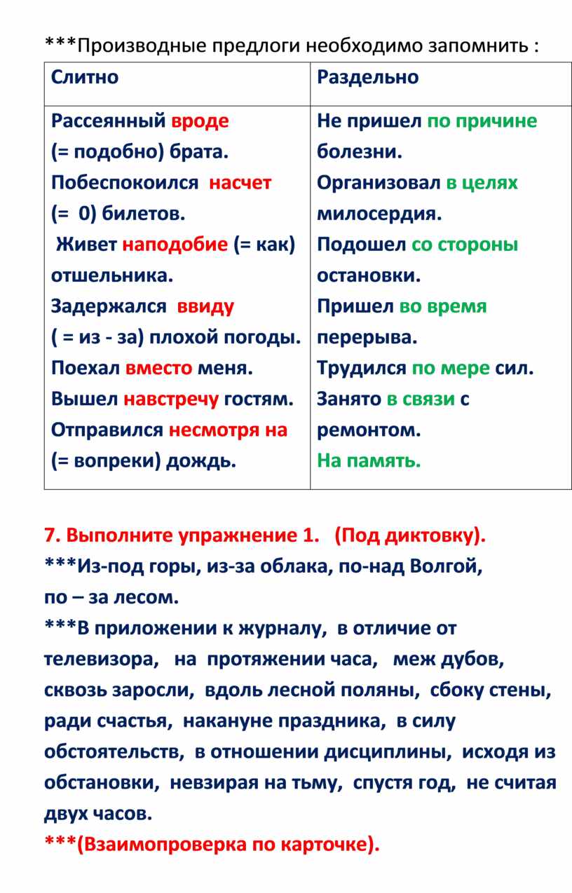Рассеянный вроде (= подобно) брата. Побеспокоился насчет (= 0) билетов. Живет наподобие (= как) отшельника. Задержался ввиду ( = из - за) плохой погоды. Поехал вместо меня. Вышел навстречу гостям. Отправился несмотря на (= вопреки) дождь. |