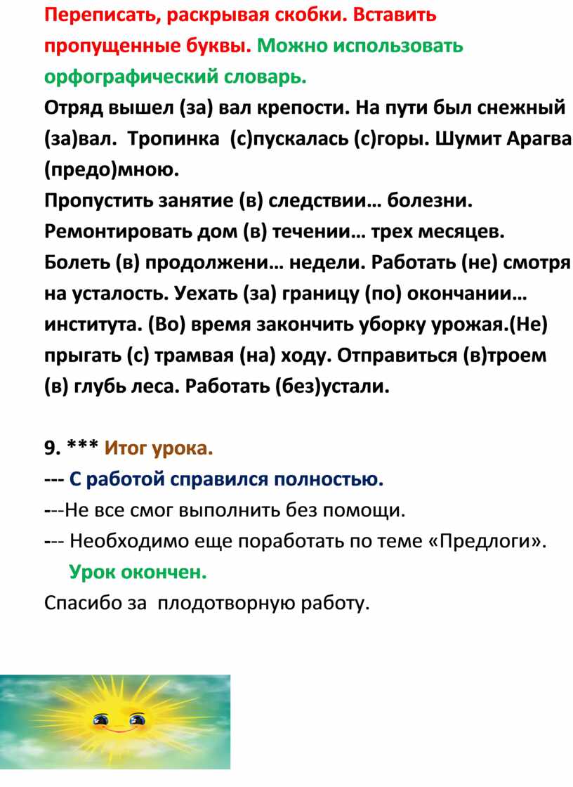 Отряд вышел (за) вал крепости. На пути был снежный (за)вал. Тропинка (с)пускалась (с)горы. Шумит Арагва (предо)мною.