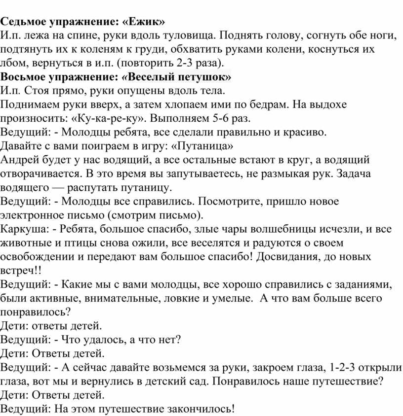 - Вот мы и прошли все те препятствия, которые нам подготовила злая волшебница. Посмотрите, какие причудливые деревья. Они как будто тянут к нам свои ветви и просят все о помощи. А как же нам помочь? Мы должны с вами сделать различные упражнения и сделать так, чтобы все злые чары исчезли. Давайте вспомним каких птиц вы знаете? А животных?